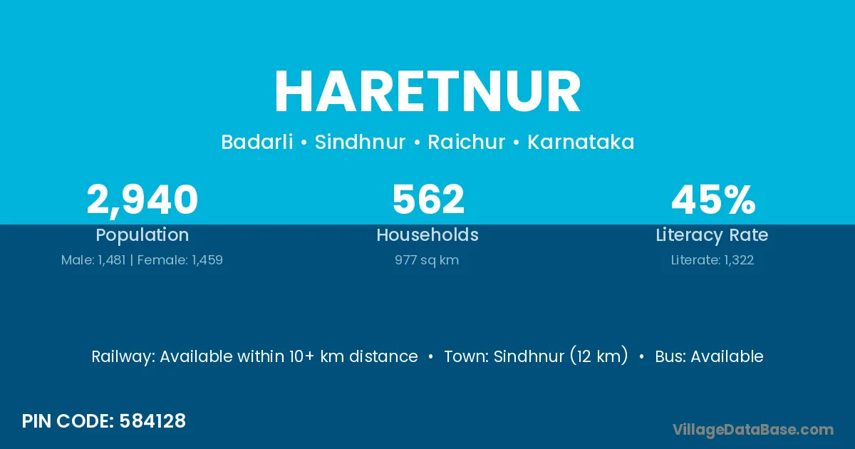 Sindhnur (12 km) is the nearest town to Haretnur village for major economic activities and is located approximately 12 km away.
