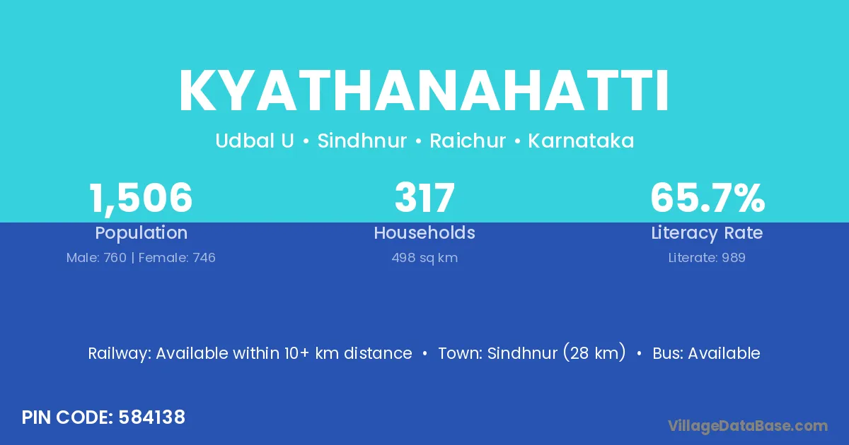 Sindhnur (28 km) is the nearest town to Kyathanahatti village for major economic activities and is located approximately 28 km away.