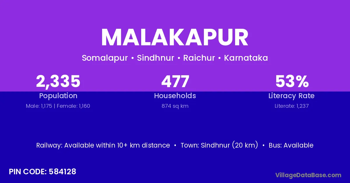 Sindhnur (20 km) is the nearest town to Malakapur village for major economic activities and is located approximately 20 km away.