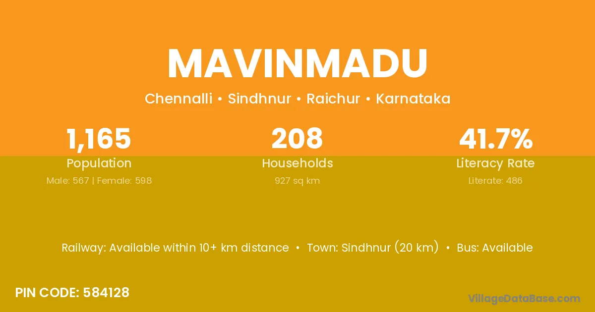 Sindhnur (20 km) is the nearest town to Mavinmadu village for major economic activities and is located approximately 20 km away.