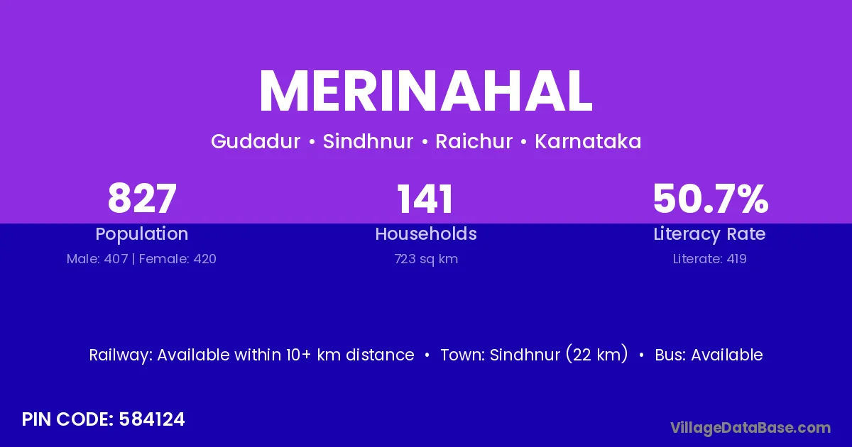 Sindhnur (22 km) is the nearest town to Merinahal village for major economic activities and is located approximately 22 km away.