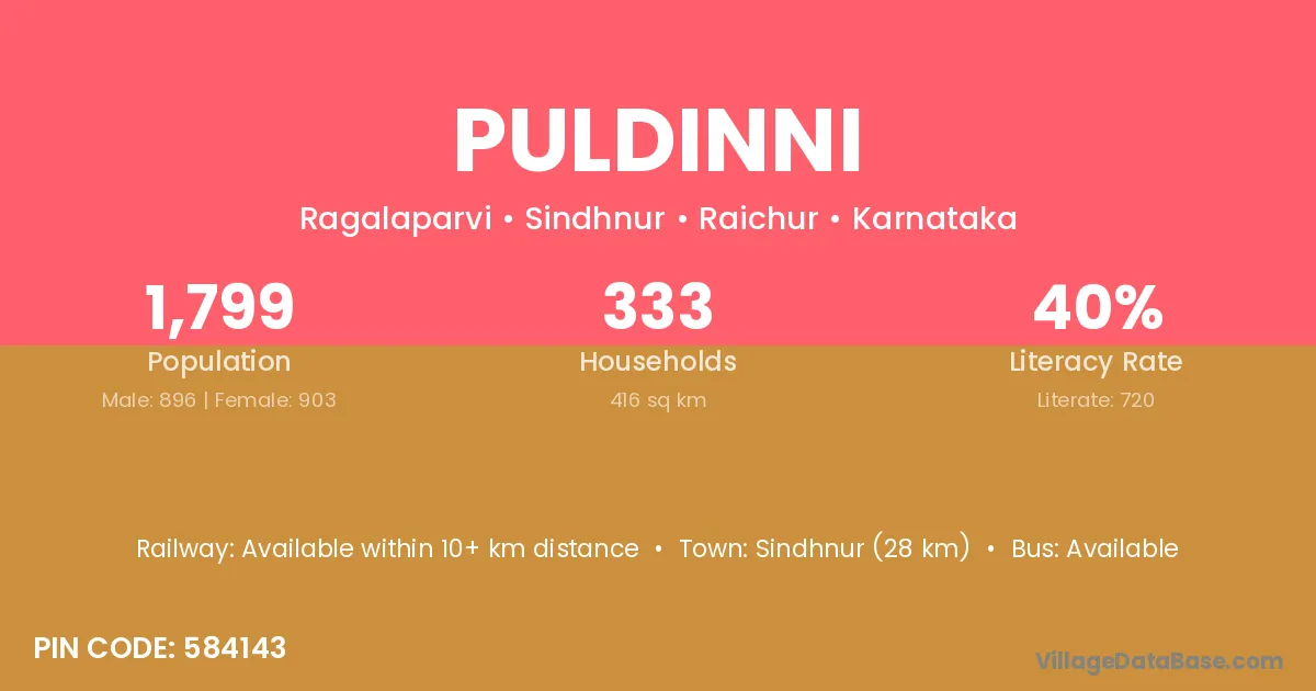 Sindhnur (28 km) is the nearest town to Puldinni village for major economic activities and is located approximately 28 km away.