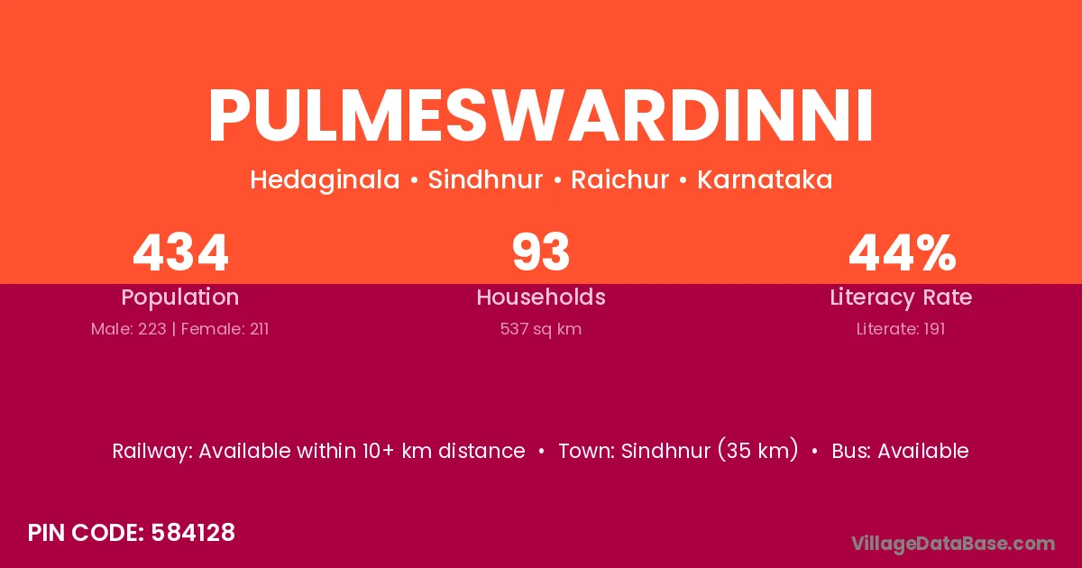 Sindhnur (35 km) is the nearest town to Pulmeswardinni village for major economic activities and is located approximately 35 km away.