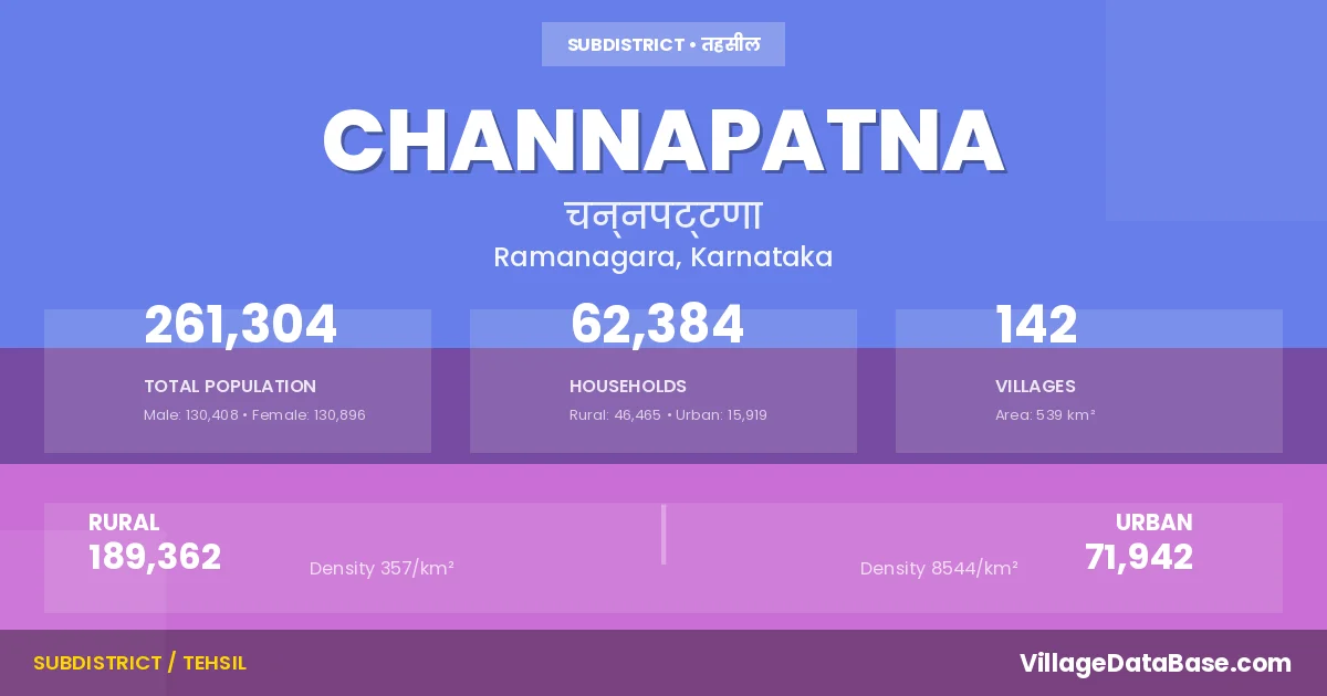 According to the 2011 census The total area of Channapatna Taluka is 539 km², with a population of 261304 people. The population density is 485 inhabitants per square kilometre, and there are approximately 62384 houses in the sub district.