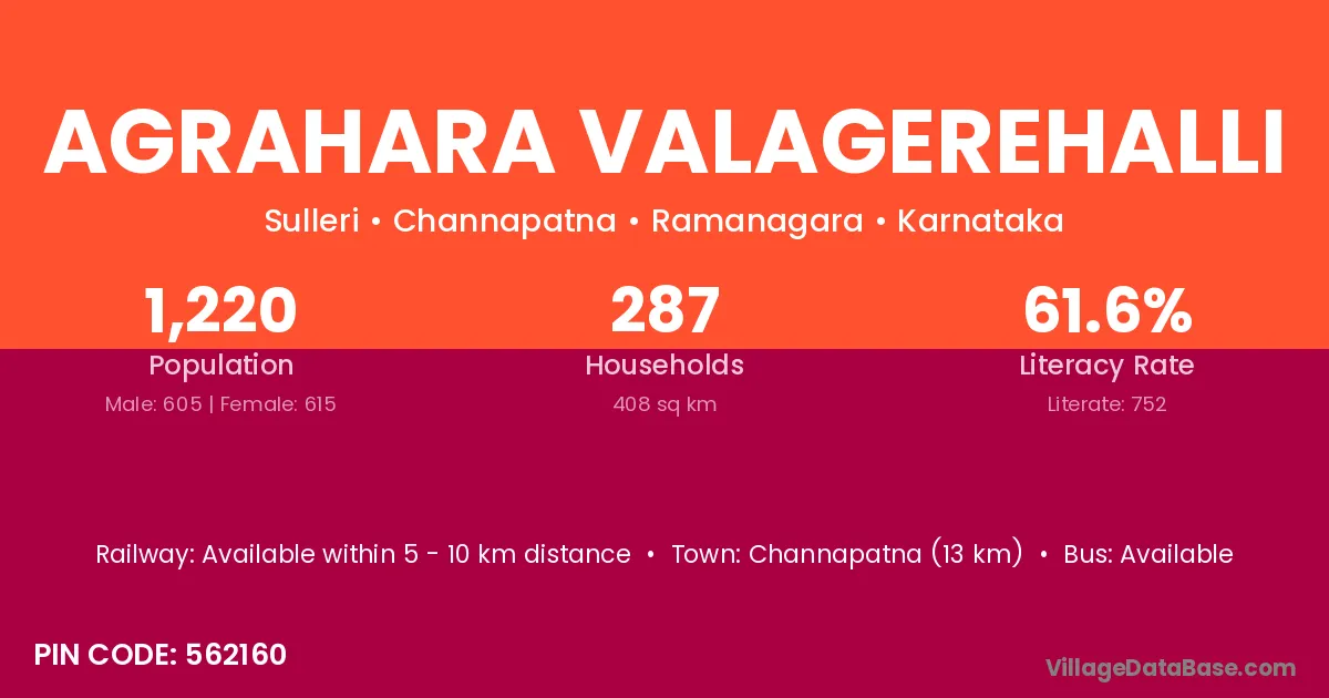 Agrahara Valagerehalli village has a total population of 1,220 people, of which 605 are males and 615 are females.