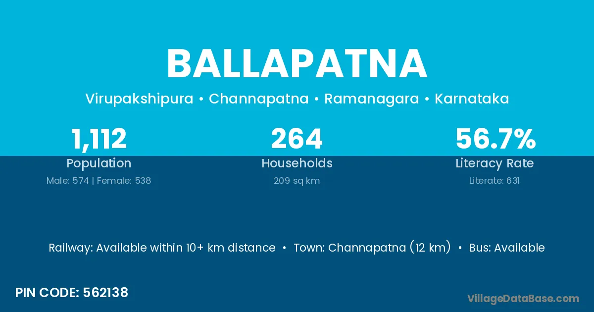Channapatna (12 km) is the nearest town to Ballapatna village for major economic activities and is located approximately 12 km away.