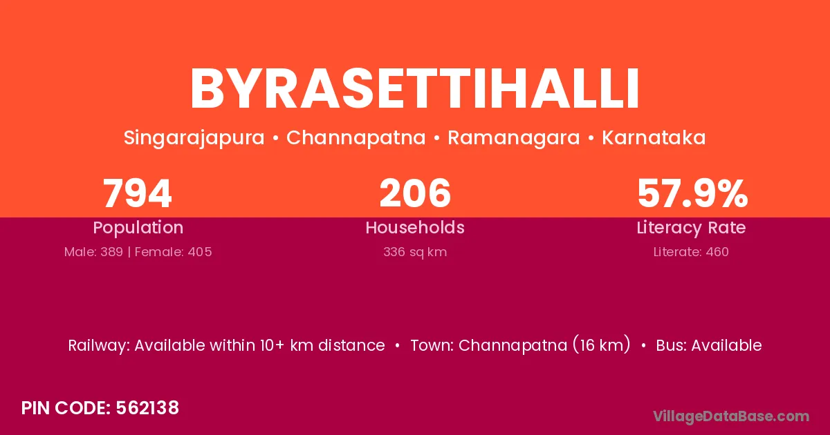Channapatna (16 km) is the nearest town to Byrasettihalli village for major economic activities and is located approximately 16 km away.