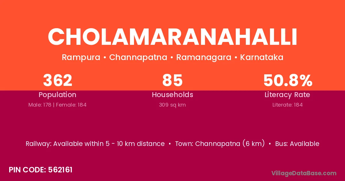 Cholamaranahalli village has a total population of 362 people, of which 178 are males and 184 are females.