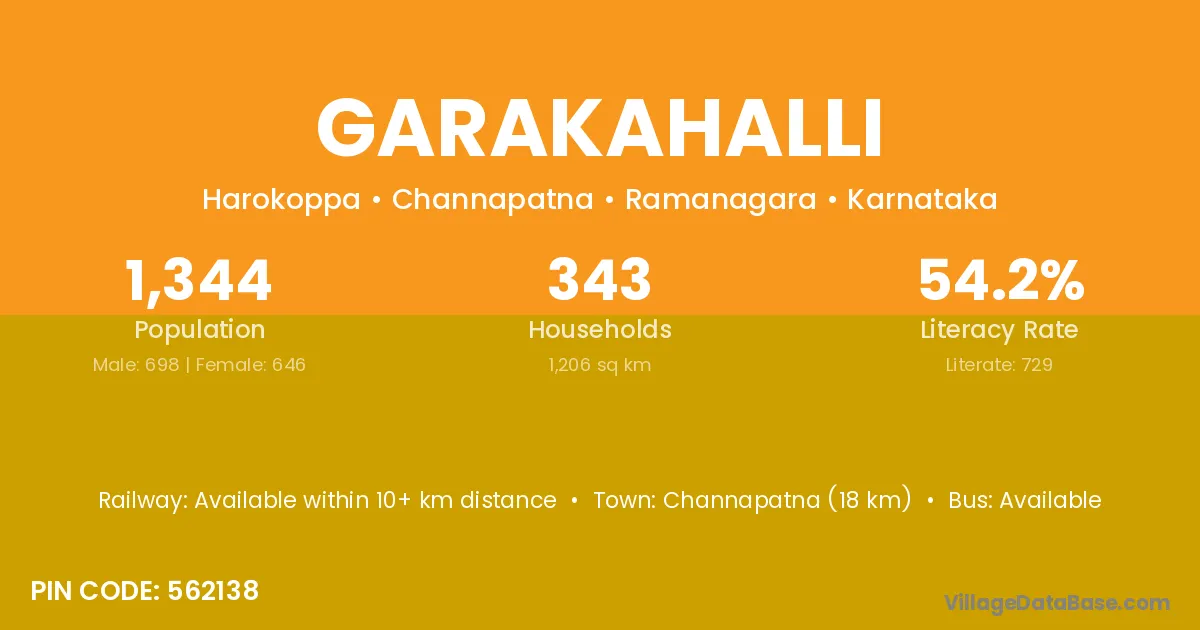 Channapatna (18 km) is the nearest town to Garakahalli village for major economic activities and is located approximately 18 km away.