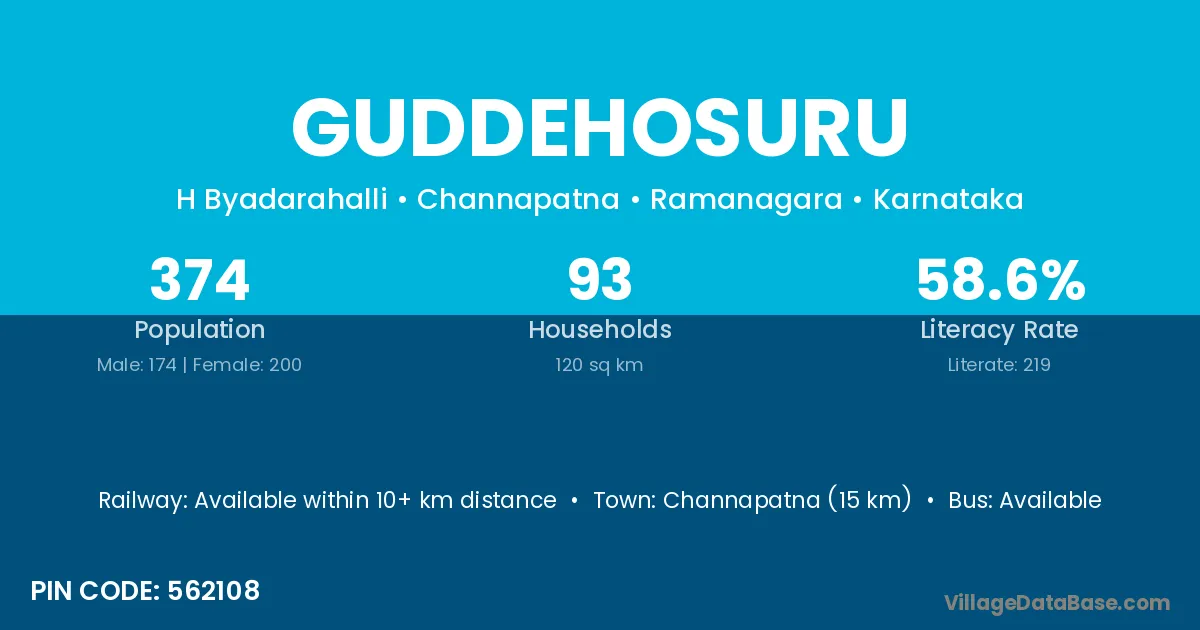 Channapatna (15 km) is the nearest town to Guddehosuru village for major economic activities and is located approximately 15 km away.