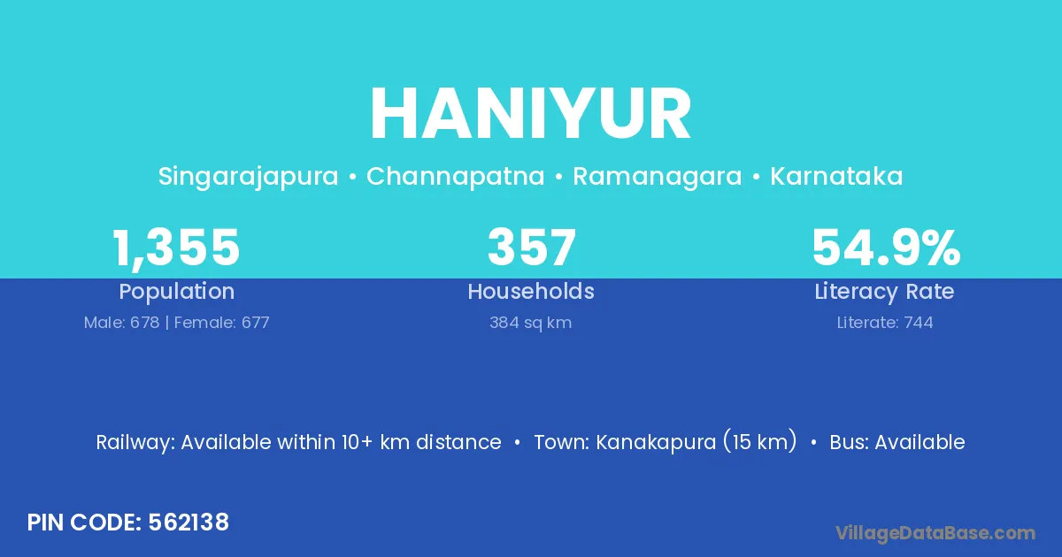 Kanakapura (15 km) is the nearest town to Haniyur village for major economic activities and is located approximately 15 km away.