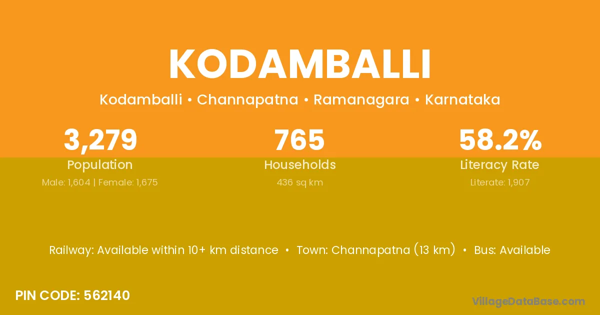 Channapatna (13 km) is the nearest town to Kodamballi village for major economic activities and is located approximately 13 km away.