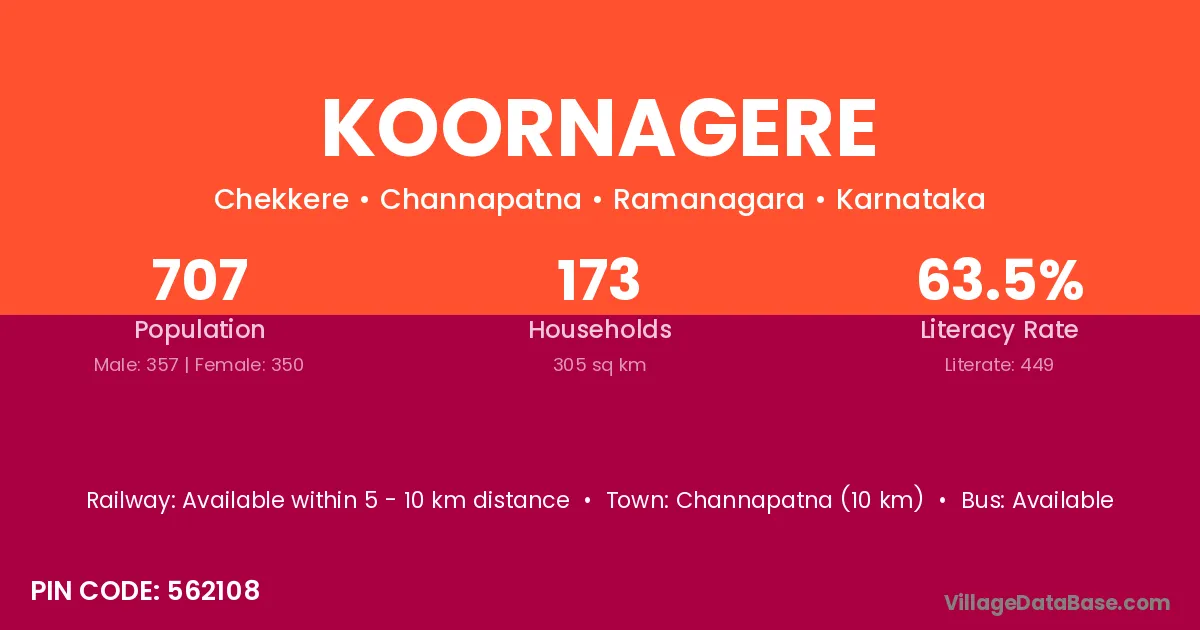 Channapatna (10 km) is the nearest town to Koornagere village for major economic activities and is located approximately 10 km away.