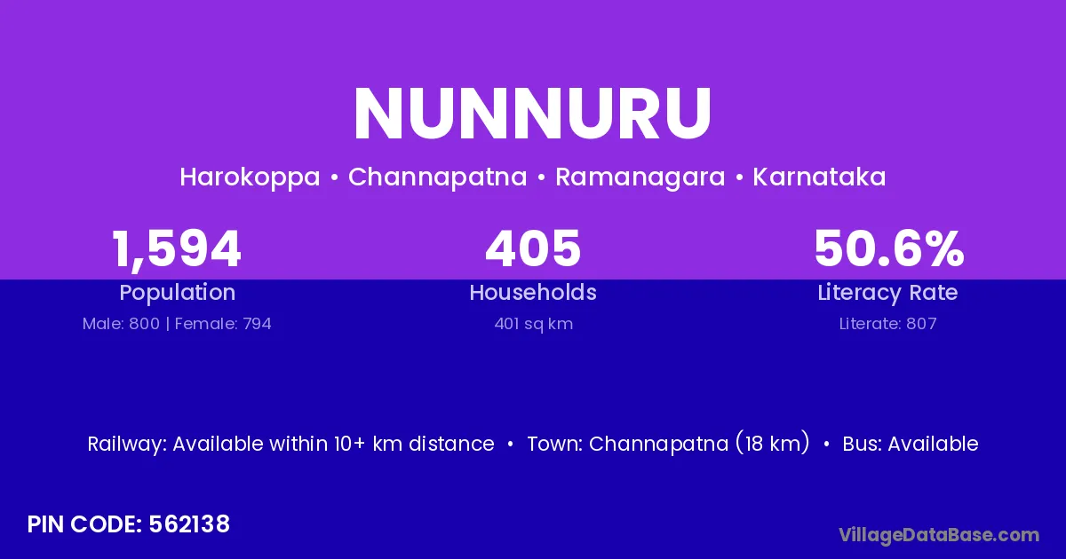 Channapatna (18 km) is the nearest town to Nunnuru village for major economic activities and is located approximately 18 km away.