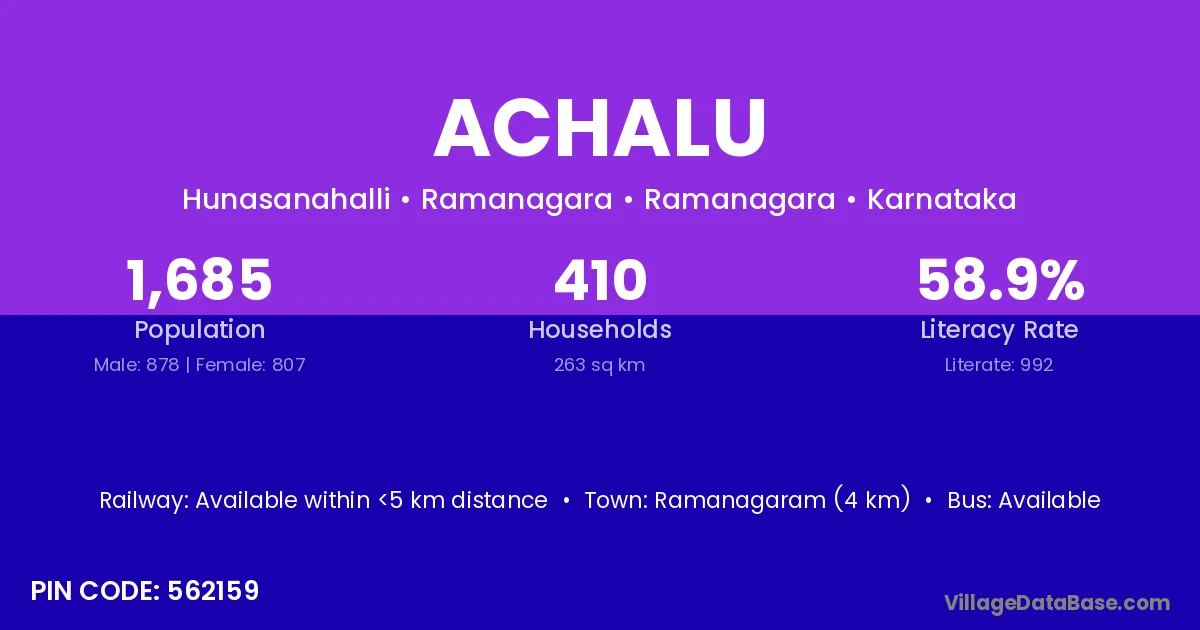 Kanakapura (18 km) is the nearest town to Achalu village for major economic activities and is located approximately 18 km away.