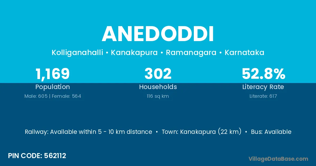 Kanakapura (22 km) is the nearest town to Anedoddi village for major economic activities and is located approximately 22 km away.