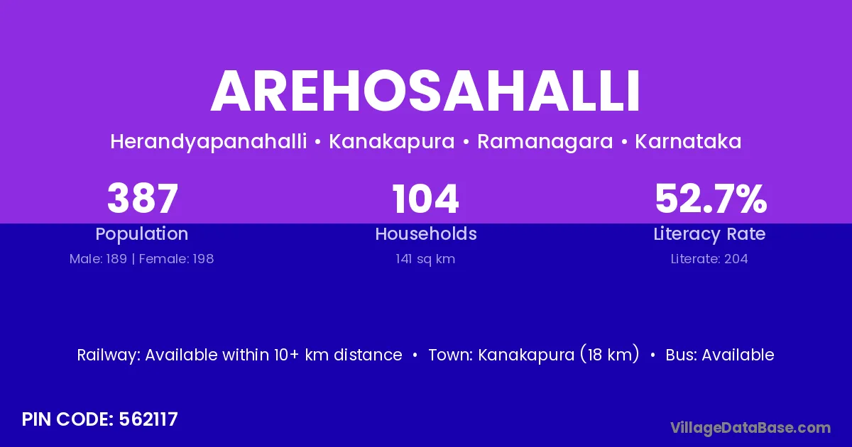 Kanakapura (18 km) is the nearest town to Arehosahalli village for major economic activities and is located approximately 18 km away.