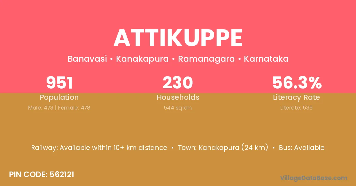 Kanakapura (24 km) is the nearest town to Attikuppe village for major economic activities and is located approximately 24 km away.