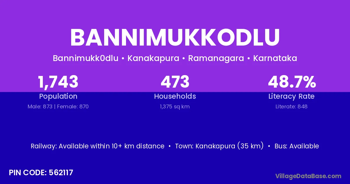Kanakapura (35 km) is the nearest town to Bannimukkodlu village for major economic activities and is located approximately 35 km away.