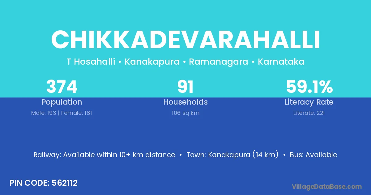 Chikkadevarahalli village has a total population of 374 people, of which 193 are males and 181 are females.