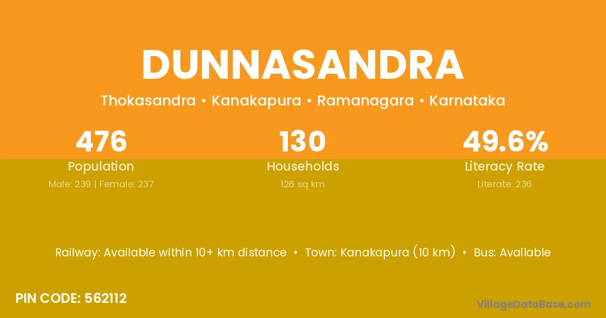 Kanakapura (10 km) is the nearest town to Dunnasandra village for major economic activities and is located approximately 10 km away.