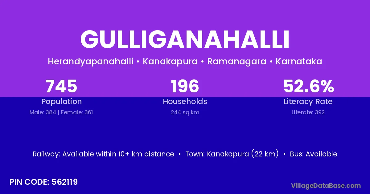 Kanakapura (22 km) is the nearest town to Gulliganahalli village for major economic activities and is located approximately 22 km away.