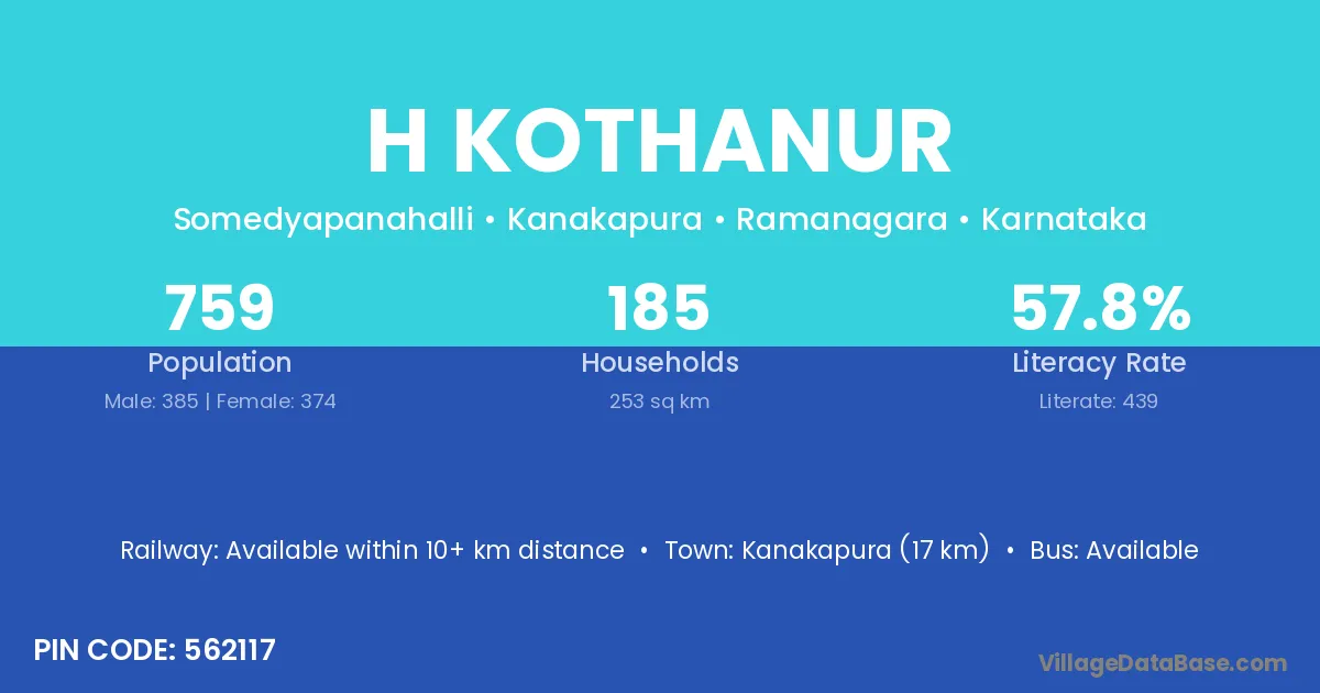 Kanakapura (17 km) is the nearest town to H Kothanur village for major economic activities and is located approximately 17 km away.