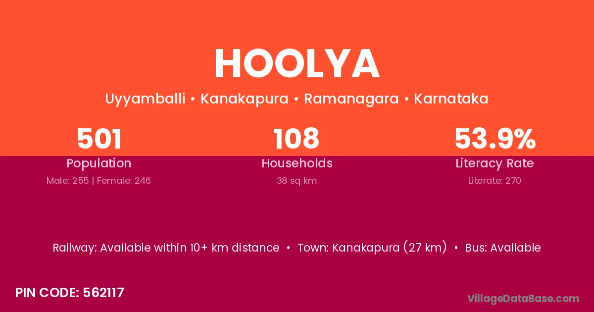 Kanakapura (27 km) is the nearest town to Hoolya village for major economic activities and is located approximately 27 km away.