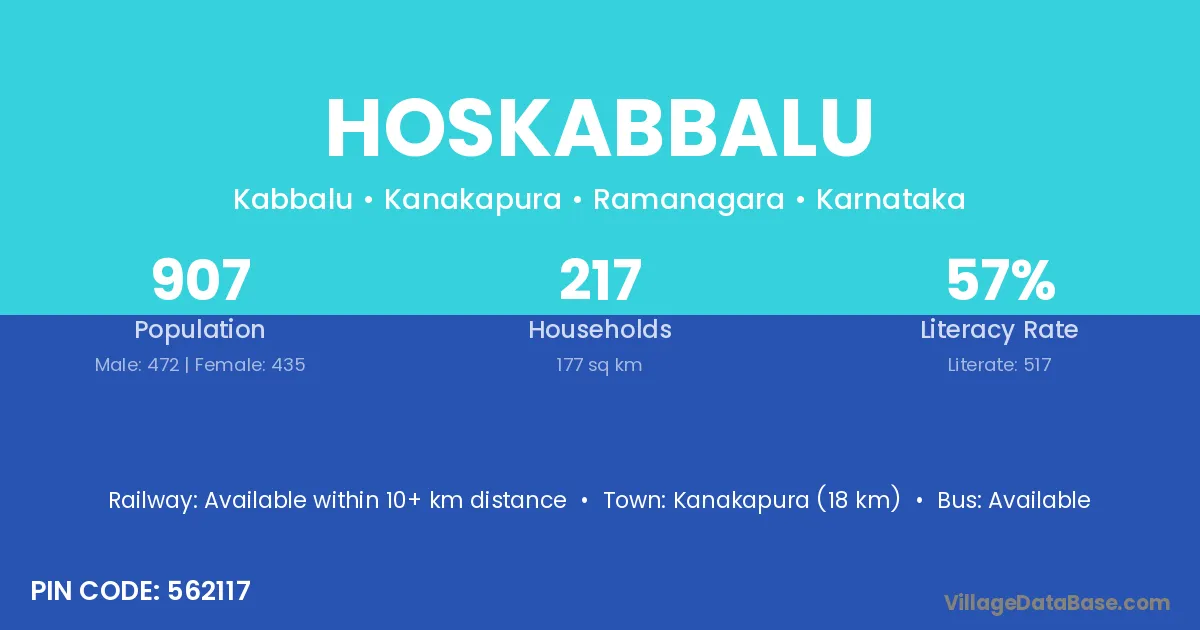 Kanakapura (18 km) is the nearest town to Hoskabbalu village for major economic activities and is located approximately 18 km away.