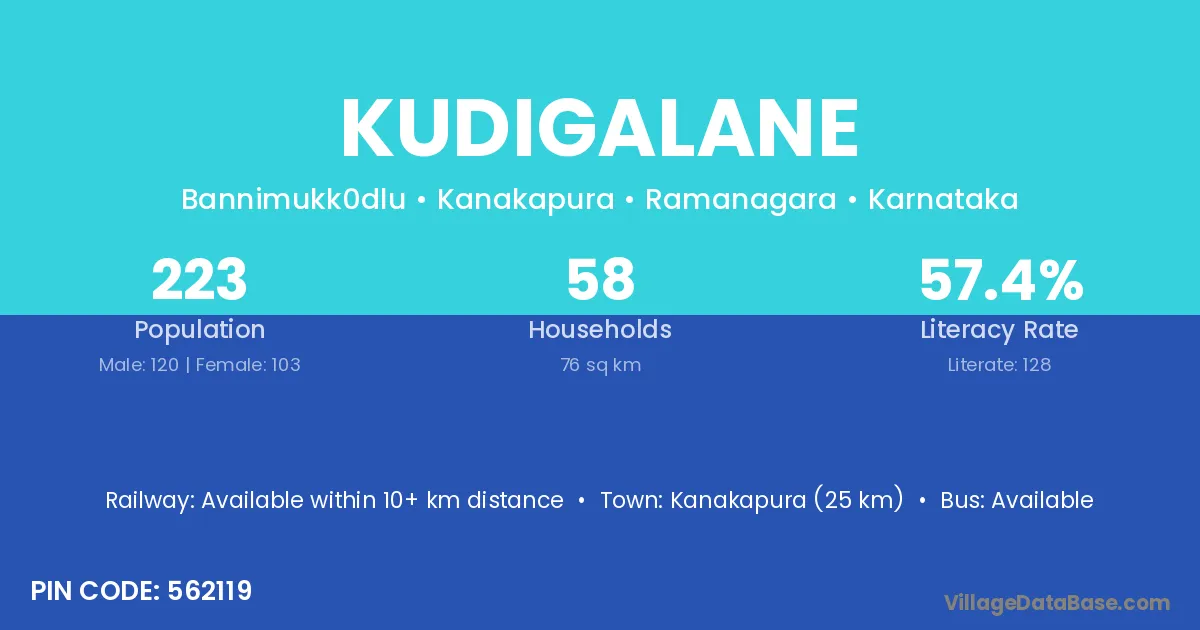 Kanakapura (25 km) is the nearest town to Kudigalane village for major economic activities and is located approximately 25 km away.
