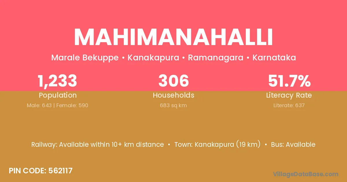 Mahimanahalli village has a total population of 1,233 people, of which 643 are males and 590 are females.