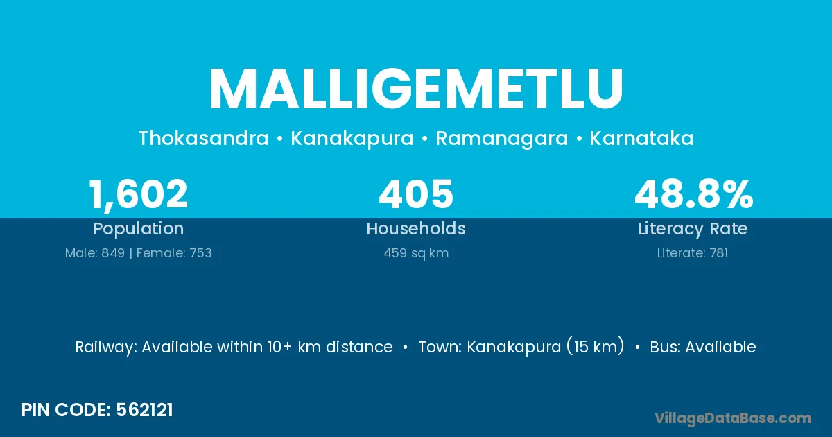 Kanakapura (15 km) is the nearest town to Malligemetlu village for major economic activities and is located approximately 15 km away.