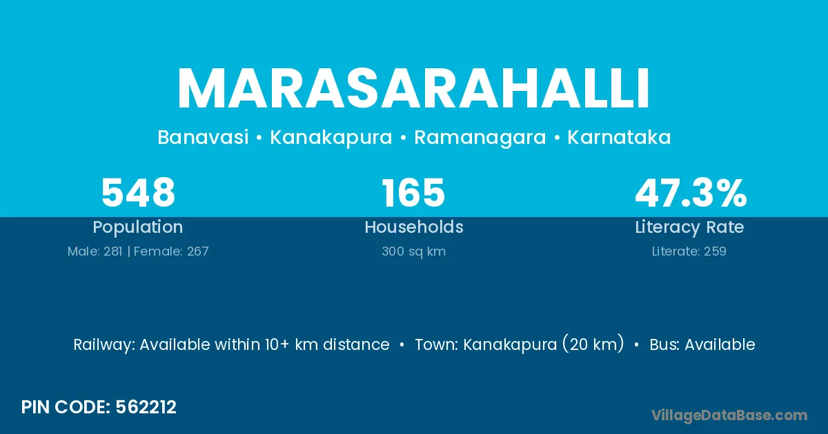 Kanakapura (20 km) is the nearest town to Marasarahalli village for major economic activities and is located approximately 20 km away.