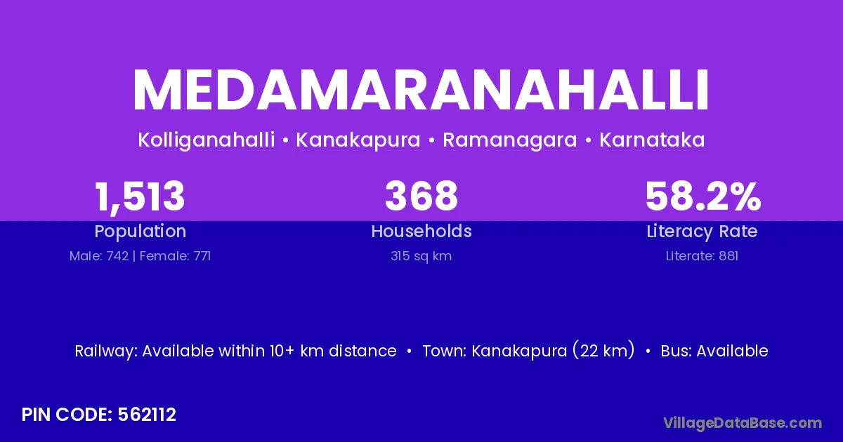 Kanakapura (22 km) is the nearest town to Medamaranahalli village for major economic activities and is located approximately 22 km away.