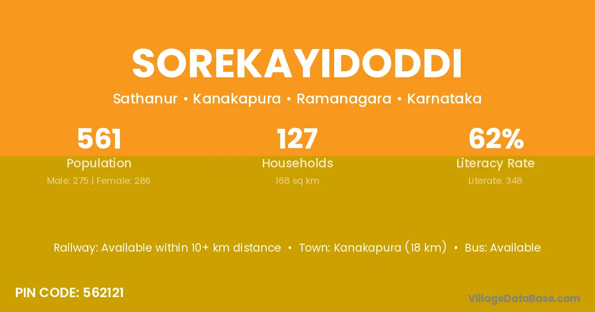 Kanakapura (18 km) is the nearest town to Sorekayidoddi village for major economic activities and is located approximately 18 km away.