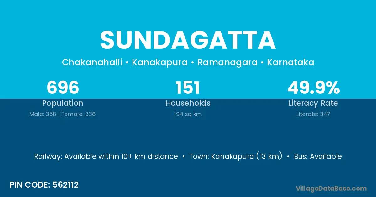 Kanakapura (13 km) is the nearest town to Sundagatta village for major economic activities and is located approximately 13 km away.