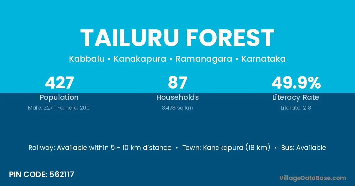 Kanakapura (18 km) is the nearest town to Tailuru Forest village for major economic activities and is located approximately 18 km away.