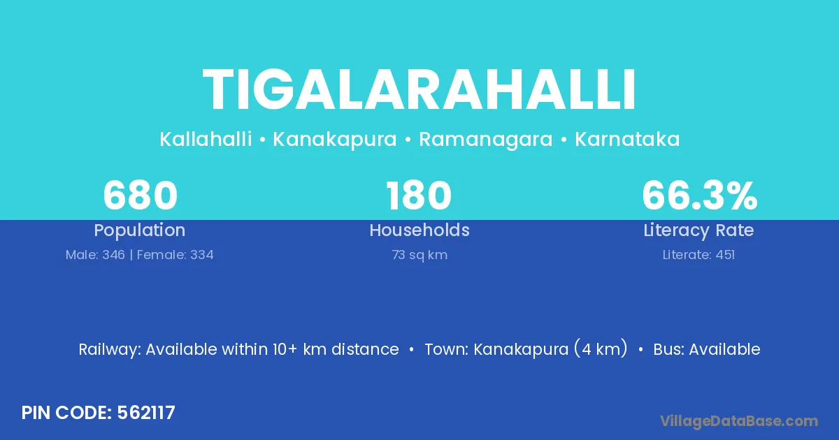Kanakapura (4 km) is the nearest town to Tigalarahalli village for major economic activities and is located approximately 4 km away.