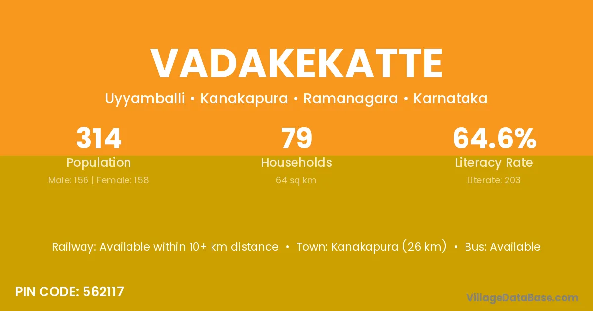 Kanakapura (26 km) is the nearest town to Vadakekatte village for major economic activities and is located approximately 26 km away.