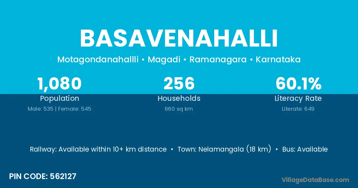 Nelamangala (18 km) is the nearest town to Basavenahalli village for major economic activities and is located approximately 18 km away.
