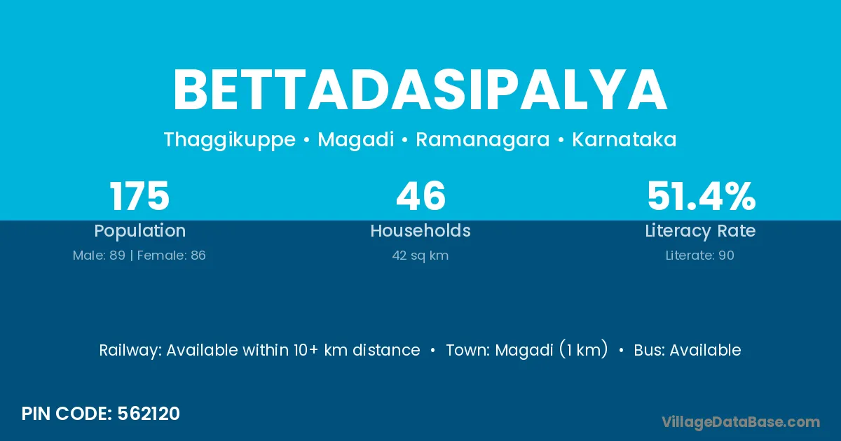 Magadi (1 km) is the nearest town to Bettadasipalya village for major economic activities and is located approximately 1 km away.