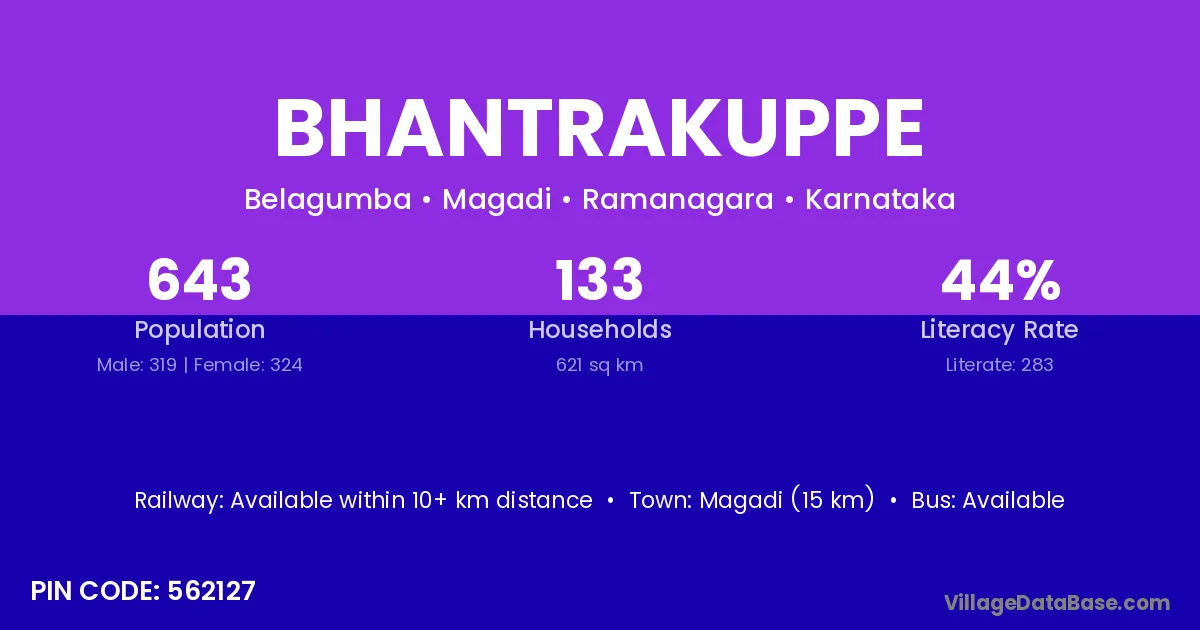 Magadi (15 km) is the nearest town to Bhantrakuppe village for major economic activities and is located approximately 15 km away.