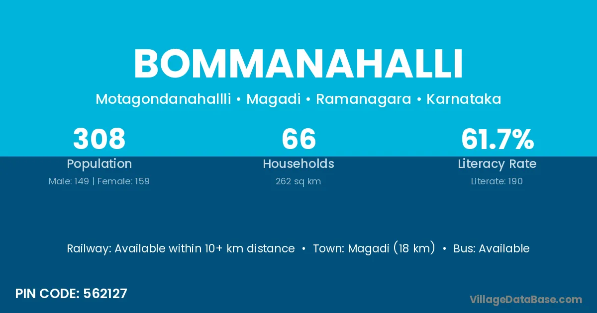 Magadi (18 km) is the nearest town to Bommanahalli village for major economic activities and is located approximately 18 km away.