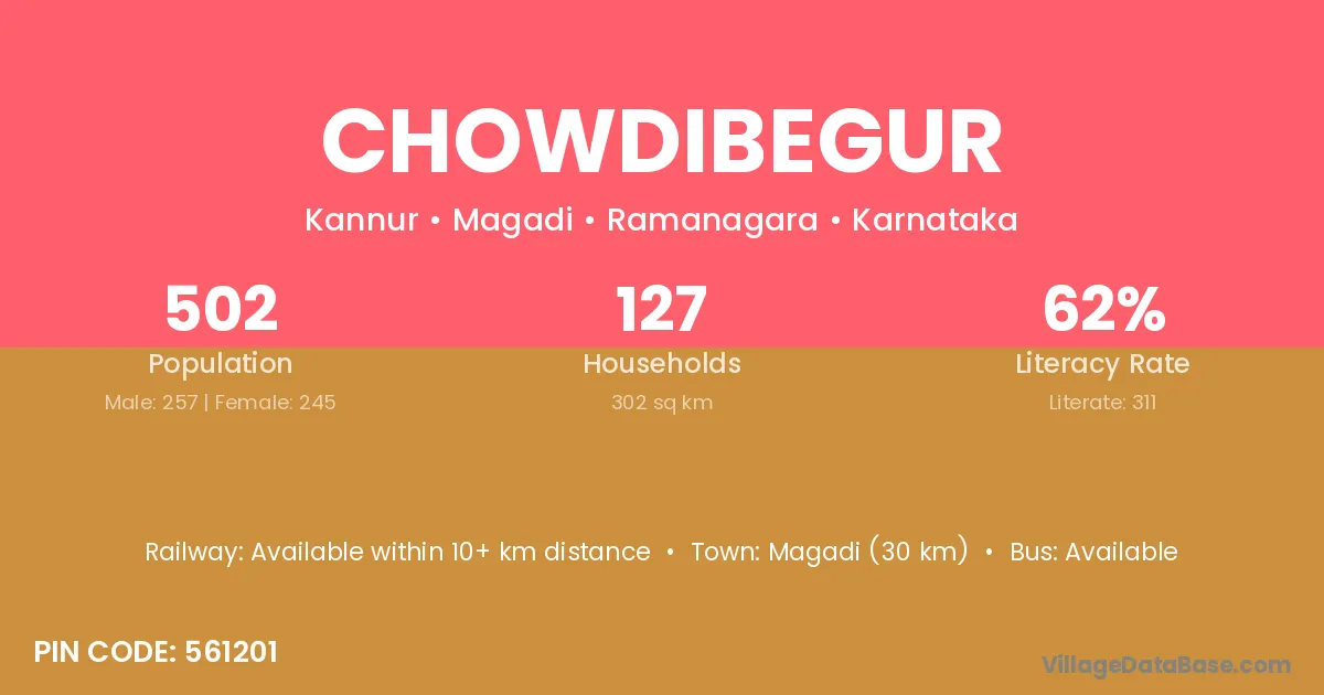 Magadi (30 km) is the nearest town to Chowdibegur village for major economic activities and is located approximately 30 km away.