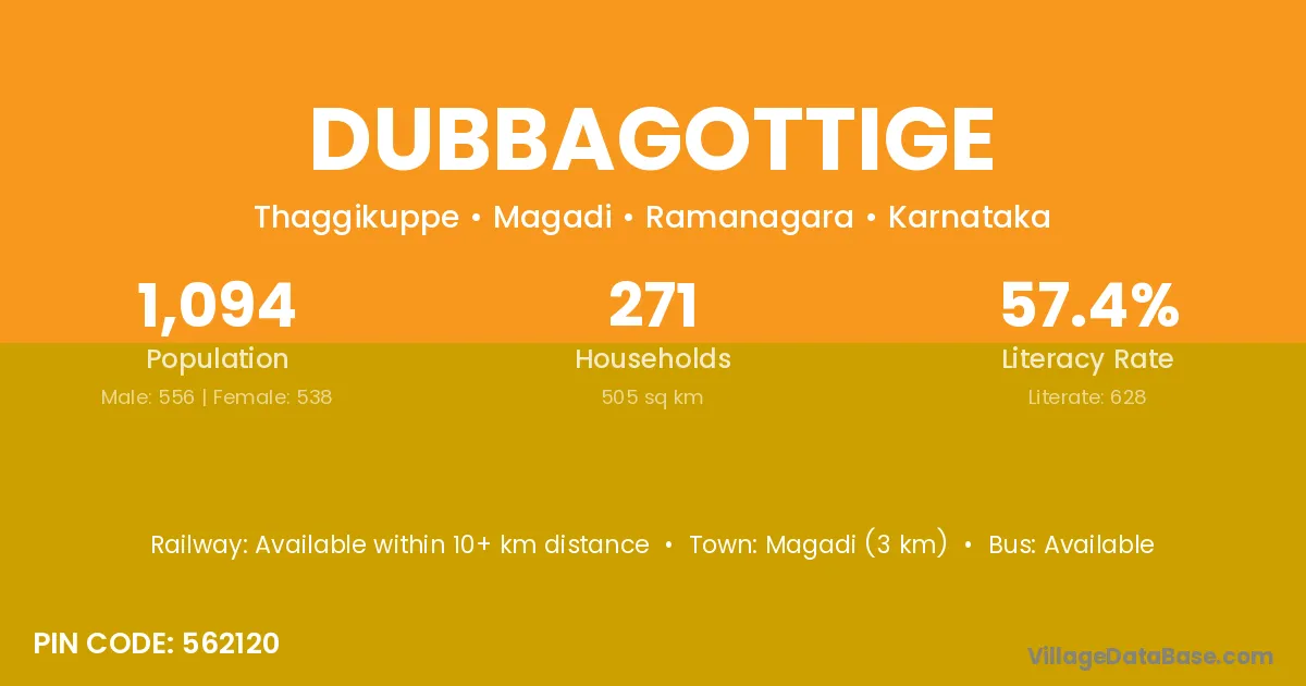 Magadi (3 km) is the nearest town to Dubbagottige village for major economic activities and is located approximately 3 km away.