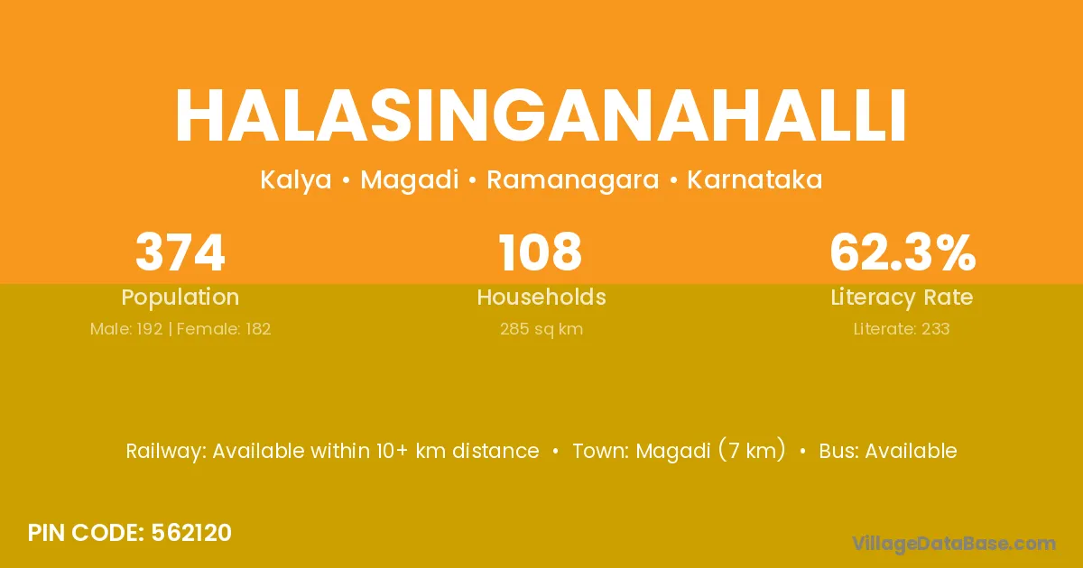 Magadi (7 km) is the nearest town to Halasinganahalli village for major economic activities and is located approximately 7 km away.