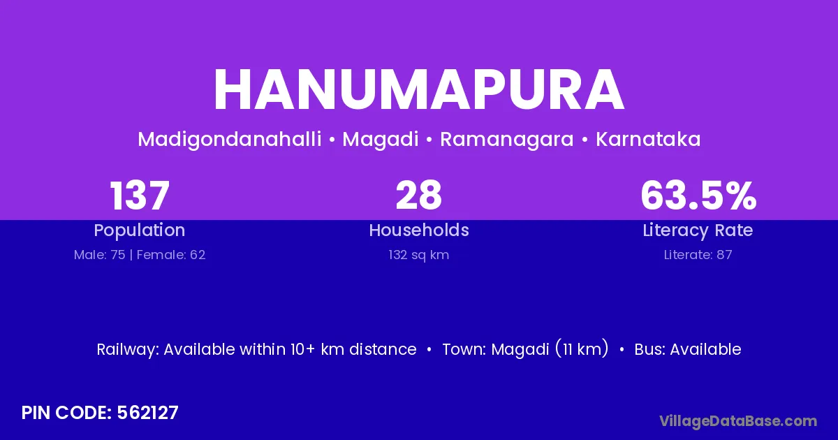 Magadi (11 km) is the nearest town to Hanumapura village for major economic activities and is located approximately 11 km away.
