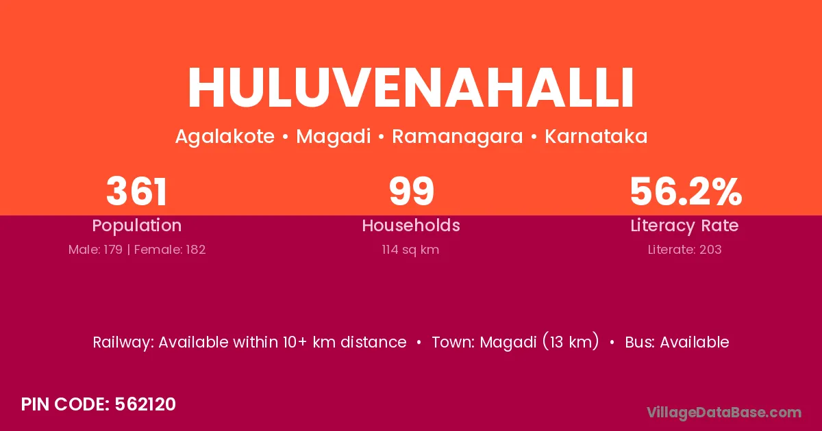 Magadi (13 km) is the nearest town to Huluvenahalli village for major economic activities and is located approximately 13 km away.