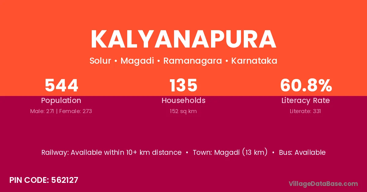 Magadi (13 km) is the nearest town to Kalyanapura village for major economic activities and is located approximately 13 km away.