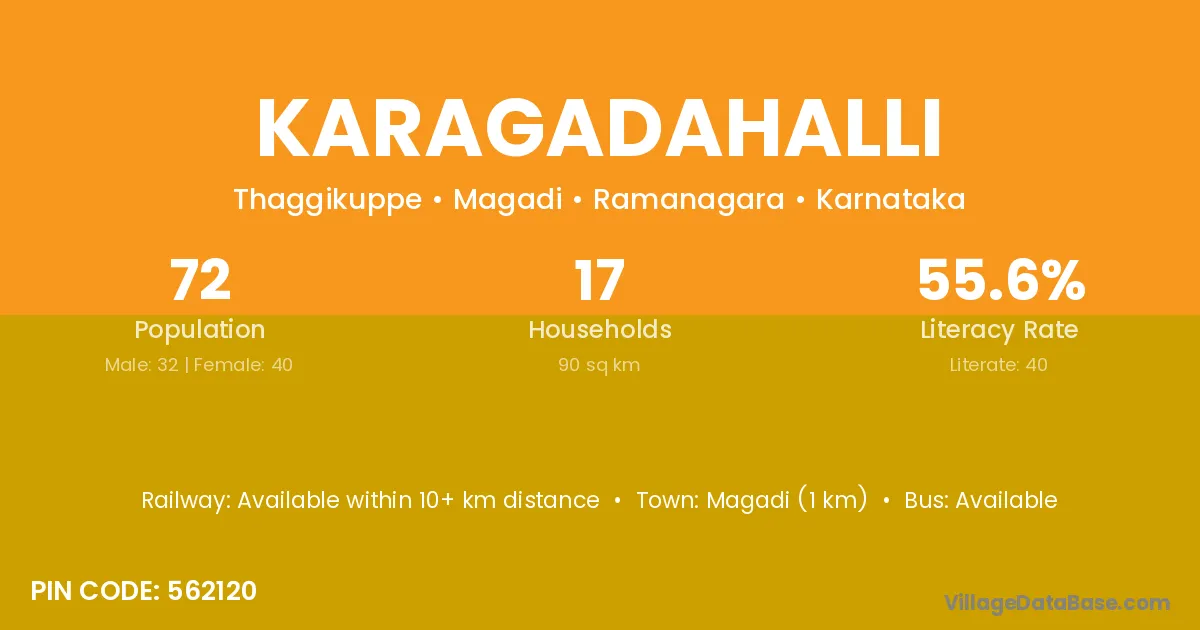 Karagadahalli village has a total population of 72 people, of which 32 are males and 40 are females.